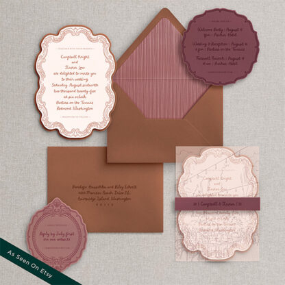 Terracotta outer envelope, chantilly cardstock for invite, rosebud cardstock for rsvp, marsala cardstock for details, letterpress, terrracotta ink, vellum wrap, belly band, with a rosebud liner. After ordering you will receive a pdf proof. You?ll be able to make changes and corrections. Fully-printed samples are available for $50 (specialty printing not included).