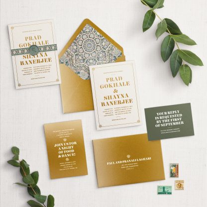 Gold foil, printed belly band, sequoia wax seal, white ink, with a floral liner (ribbon available separately)