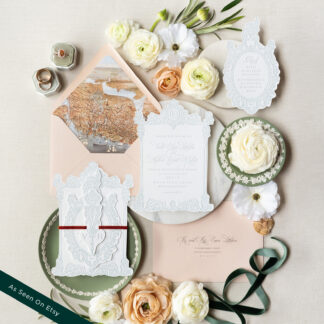 The vintage borders and letterpress printing combine to create a rich tapestry. Perfect for formal affairs.
