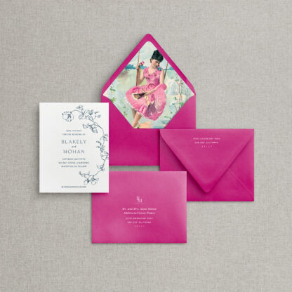 Impactful, floral pattern frames the elegant typography. Perfect for formal or garden affairs.