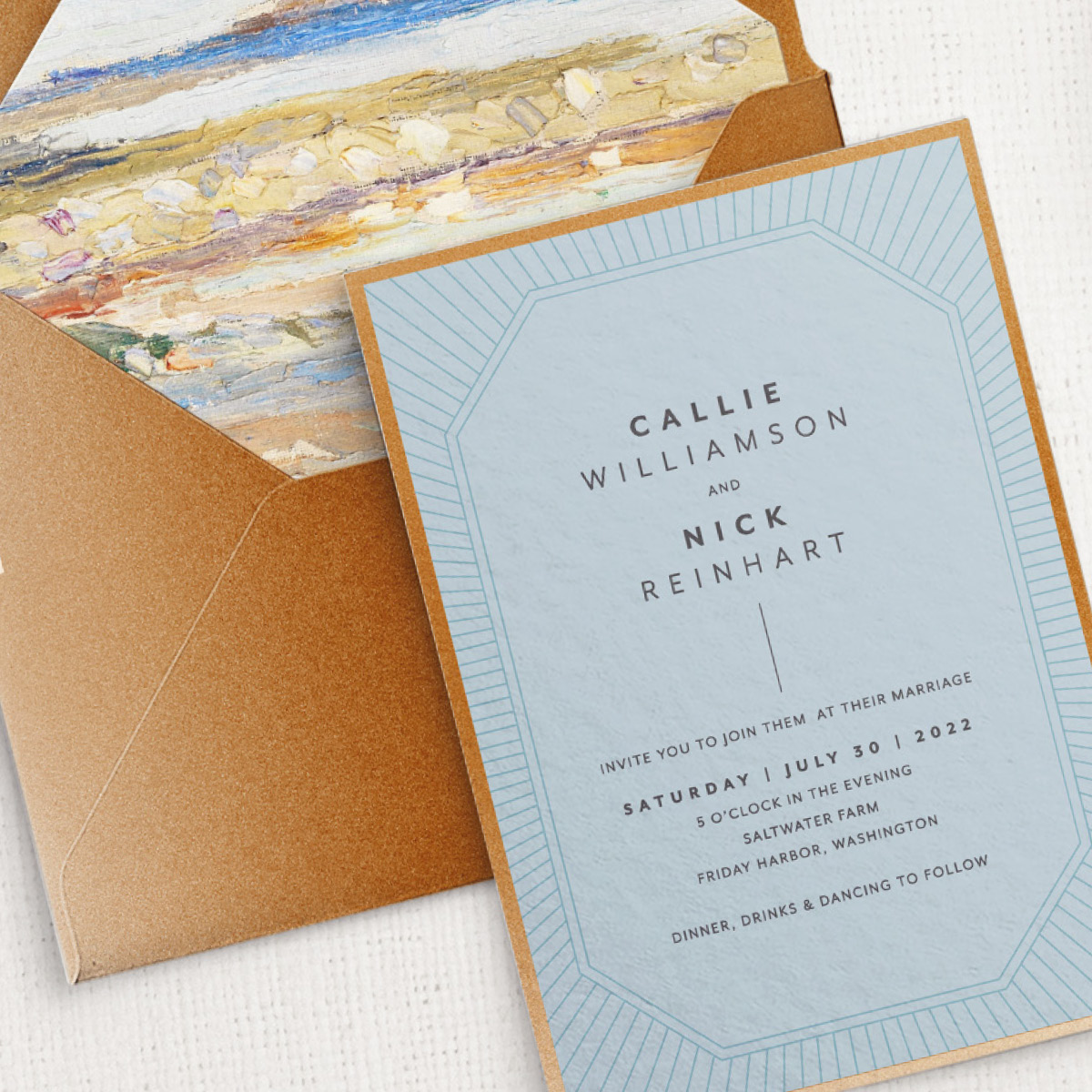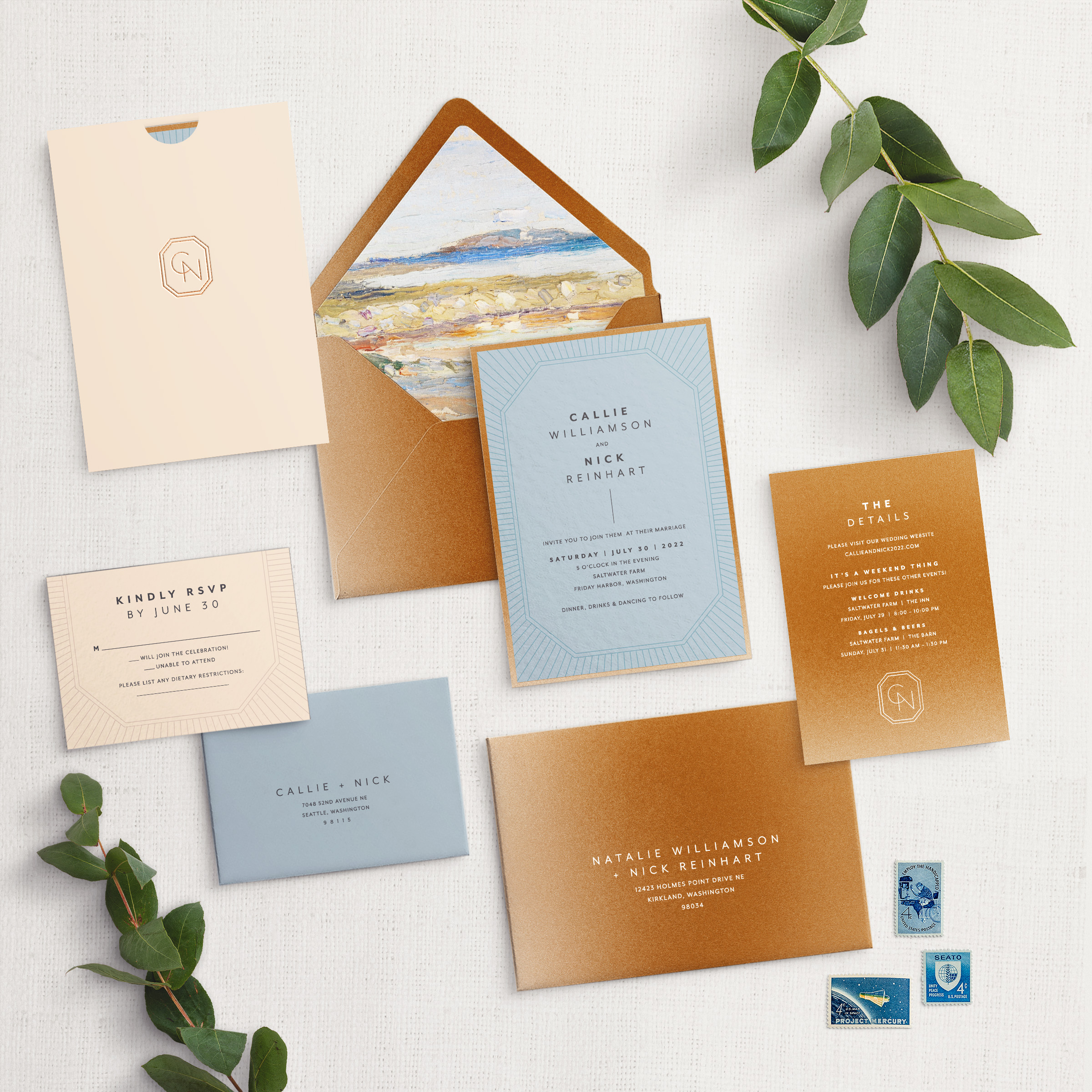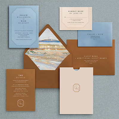 Amber outer envelope, slate cardstock for invite, beach cardstock for rsvp, slate rsvp envelope, amber cardstock for details, beach wallaby pouch, charcoal ink