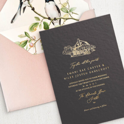 Blossom envelopes, midnight cardstock for invitation, white cardstock for rsvp and details, matte gold foil (to have it all foiled as shown, also select ‘yes, please’ for the prompt ‘Foil some/all text on my invite’?’), with a nature-inspired liner.