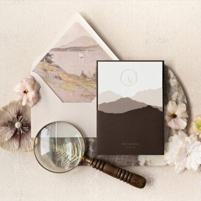 Bone outer envelope, letterpress, cotton soft white cardstock for invite, mushroom for rsvp, bone for details, printed chestnut sleeve pouch, bone, beach and mushroom ink, with a liner. After ordering you will receive a pdf proof. You?ll be able to make changes and corrections. Fully-printed samples are available for $50 (specialty printing not included).