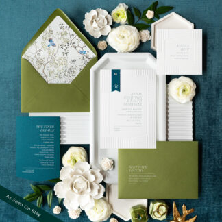 Bone outer envelope, cotton soft white cardstock for invite and details, letterpress, blind deboss, and matte gold foil, with a mushroom sleeve pouch, white ink, with a printed liner. After ordering you will receive a pdf proof. You?ll be able to make changes and corrections. Fully-printed samples are available for $50 (specialty printing not included).