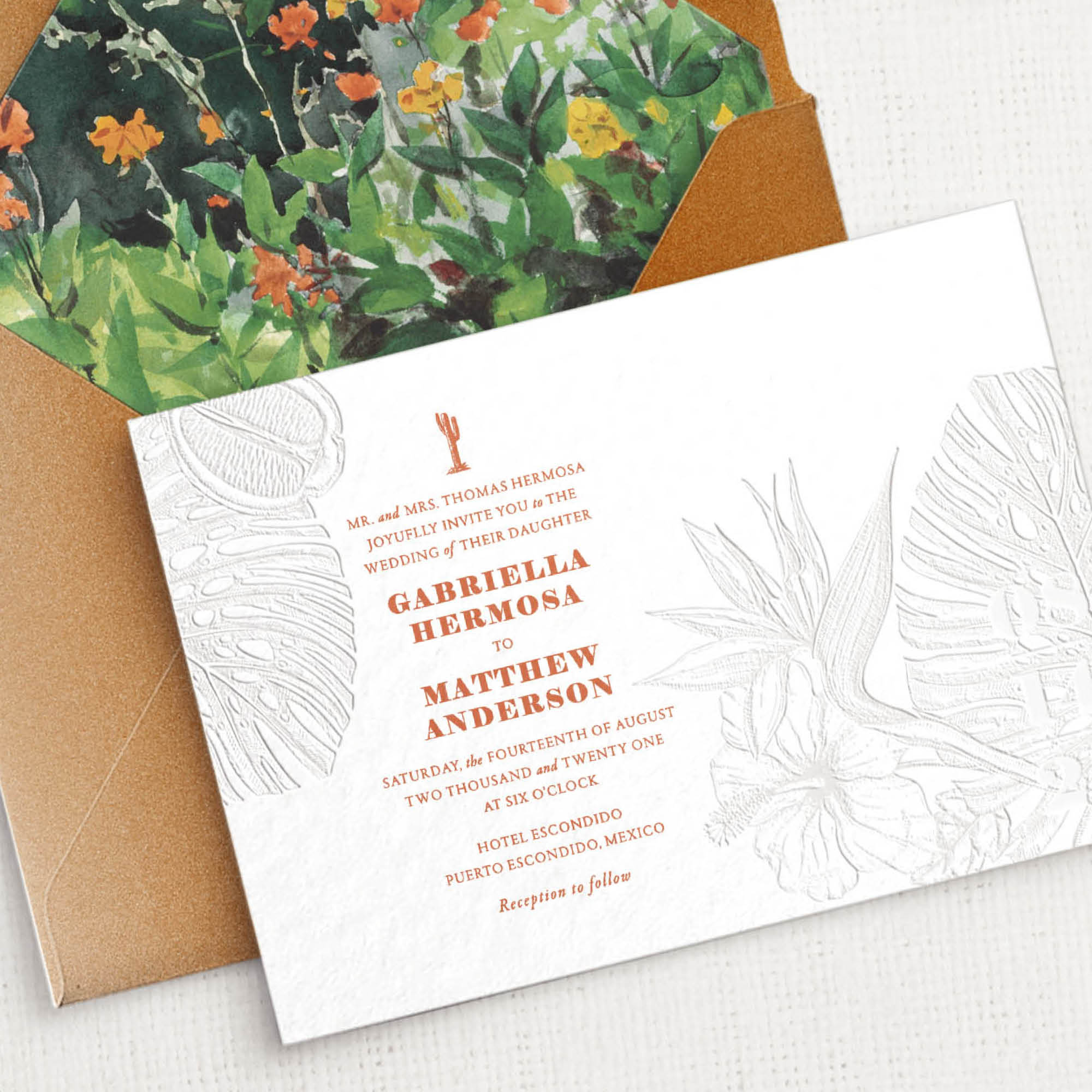 Amber envelopes, white cardstock for the invite, beach for the rsvp, forest for the details with white ink, debossed graphics with a slight hint of color, with a floral liner.