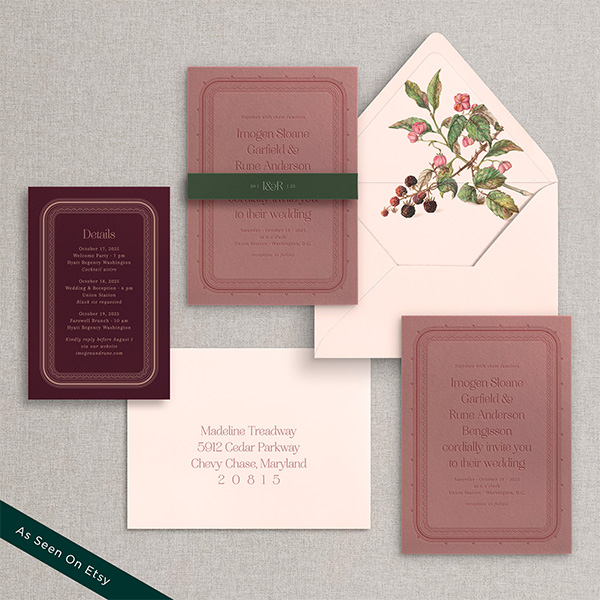 Chantilly outer envelope, rosebud cardstock for invite, merlot for details, letterpress, Sequoia belly band, white ink, with a chantilly liner. After ordering you will receive a pdf proof. You?ll be able to make changes and corrections. Fully-printed samples are available for $50 (specialty printing not included).