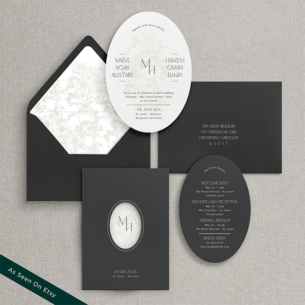 Midnight outer envelope, bare white cardstock for invite, midnight for details, 2-color foil, custom sleeve pouch, white ink, with a pearl foiled bare white liner. After ordering you will receive a pdf proof. You?ll be able to make changes and corrections. Fully-printed samples are available for $50 (specialty printing not included).