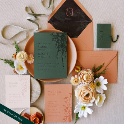 Moody and tonal hues create a lush ambiance. This invite is perfect for forest or natural settings.