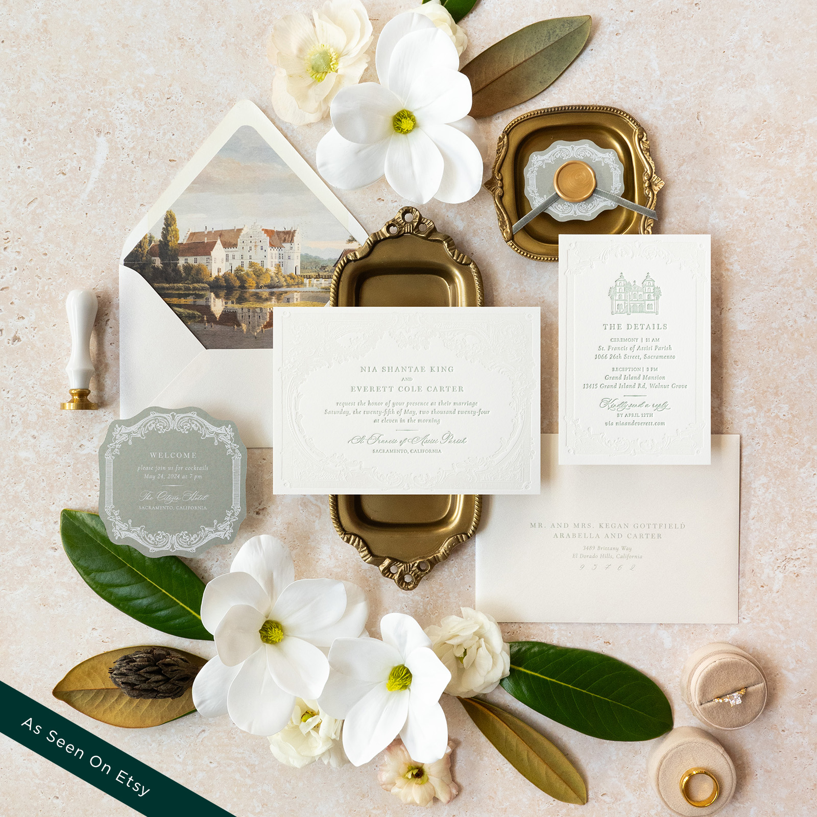 Vintage and regal paired with soft hues and letterpress printing. Perfect for formal affairs.