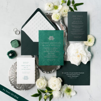 Dark Ivy outer envelope, letterpress and foil, emerald for invite, white for rsvp, dark ivy for details, emerald and white ink, with a foiled liner. After ordering you will receive a pdf proof. You?ll be able to make changes and corrections. Fully-printed samples are available for $50 (specialty printing not included).