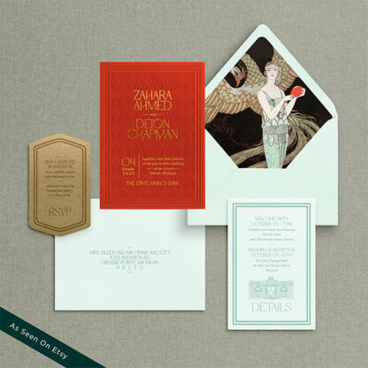 Pistachio outer envelope, chili cardstock for invite, harvest for rsvp, pistachio for details, foil, letterpress, with a printed liner. After ordering you will receive a pdf proof. You?ll be able to make changes and corrections. Fully-printed samples are available for $50 (specialty printing not included).